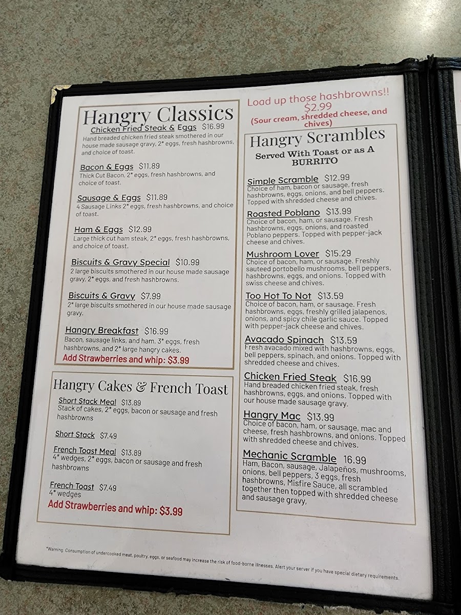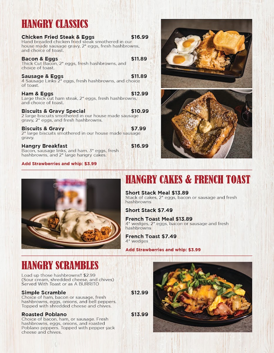 The menu extends beyond burgers, featuring Hangry Cakes and French Toast, perfect for breakfast or brunch cravings. Indulge in a satisfying Short Stack Meal that includes fluffy pancakes, eggs, and your choice of bacon or sausage. Each dish celebrates fresh ingredients and homestyle cooking, making it impossible not to feel at home.